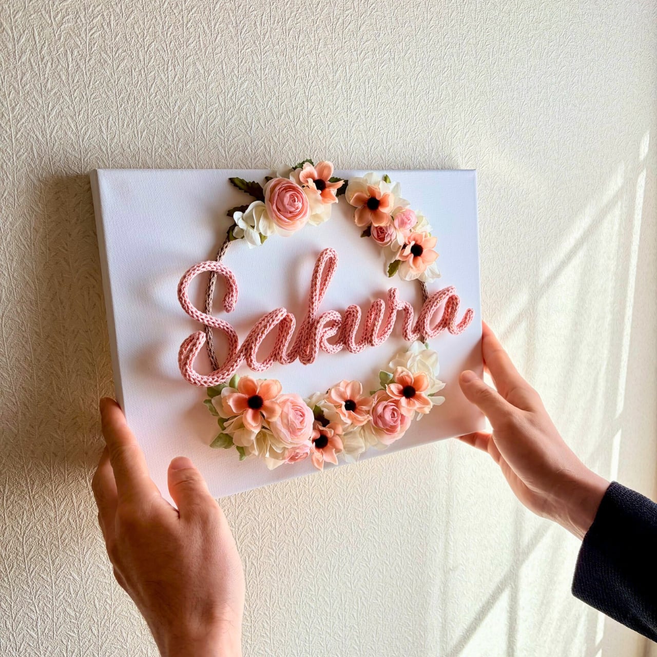 【イーゼル付き/名入れ】恋するリース/キャンバス【花色:濃いピンク】文字色12色から選べる