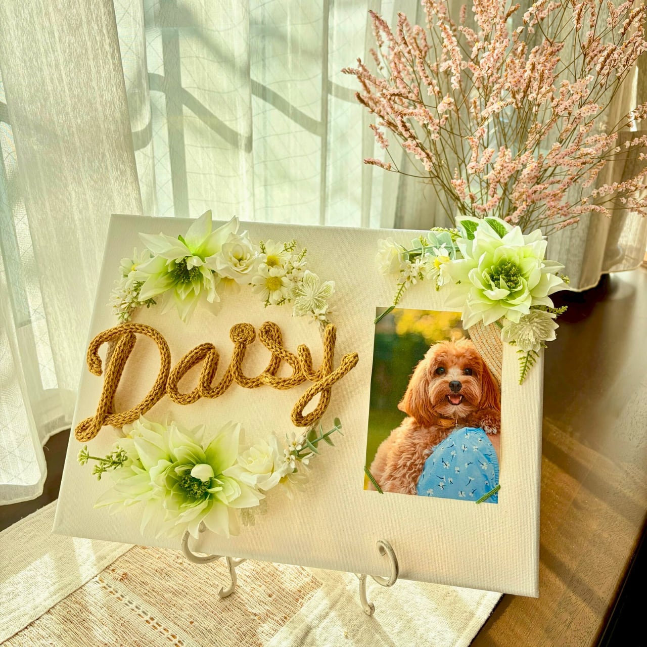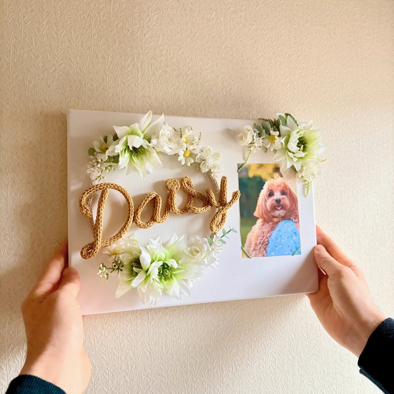 ニュアンスホワイトのリースと写真が、名前のある記憶を、静かに美しく留めてくれます。