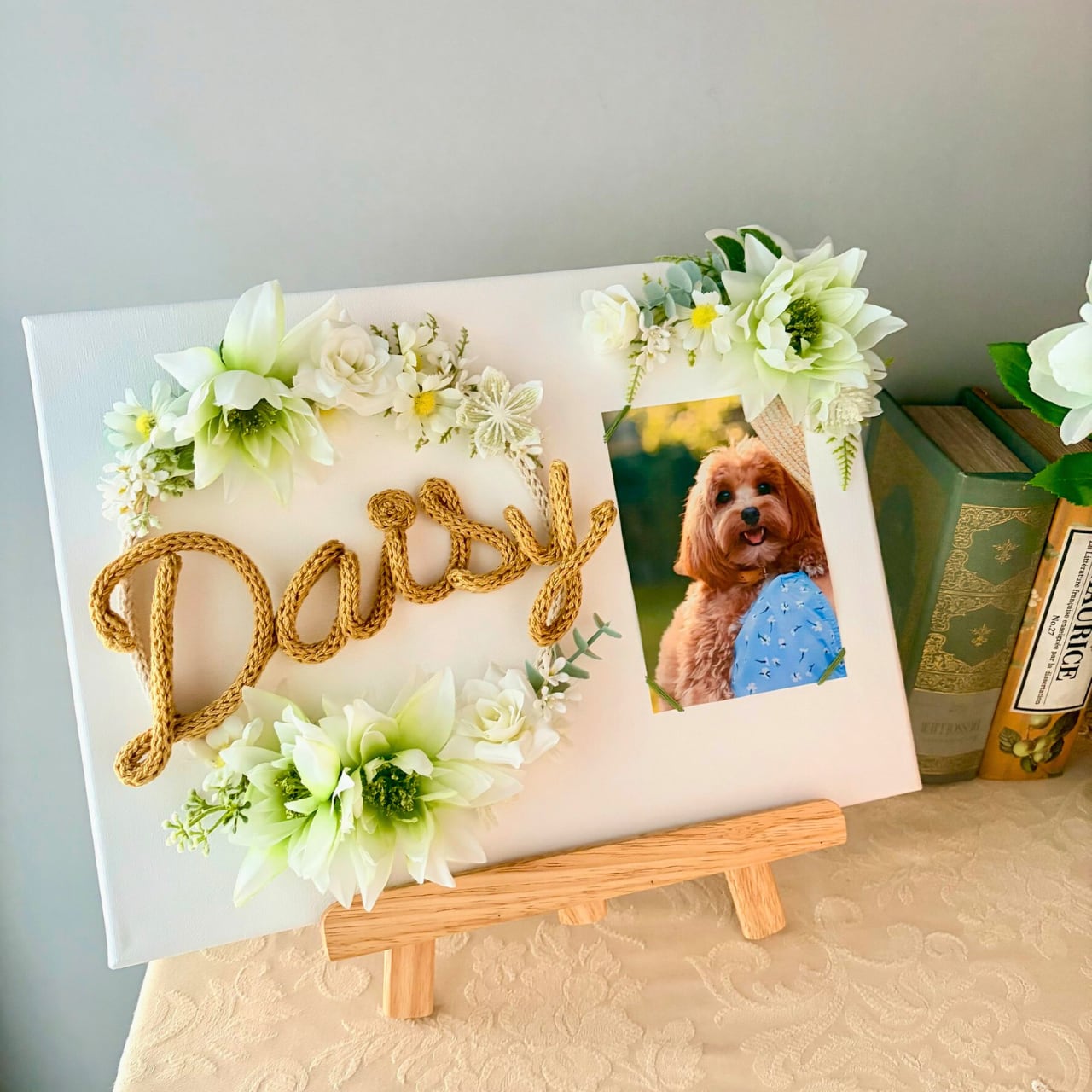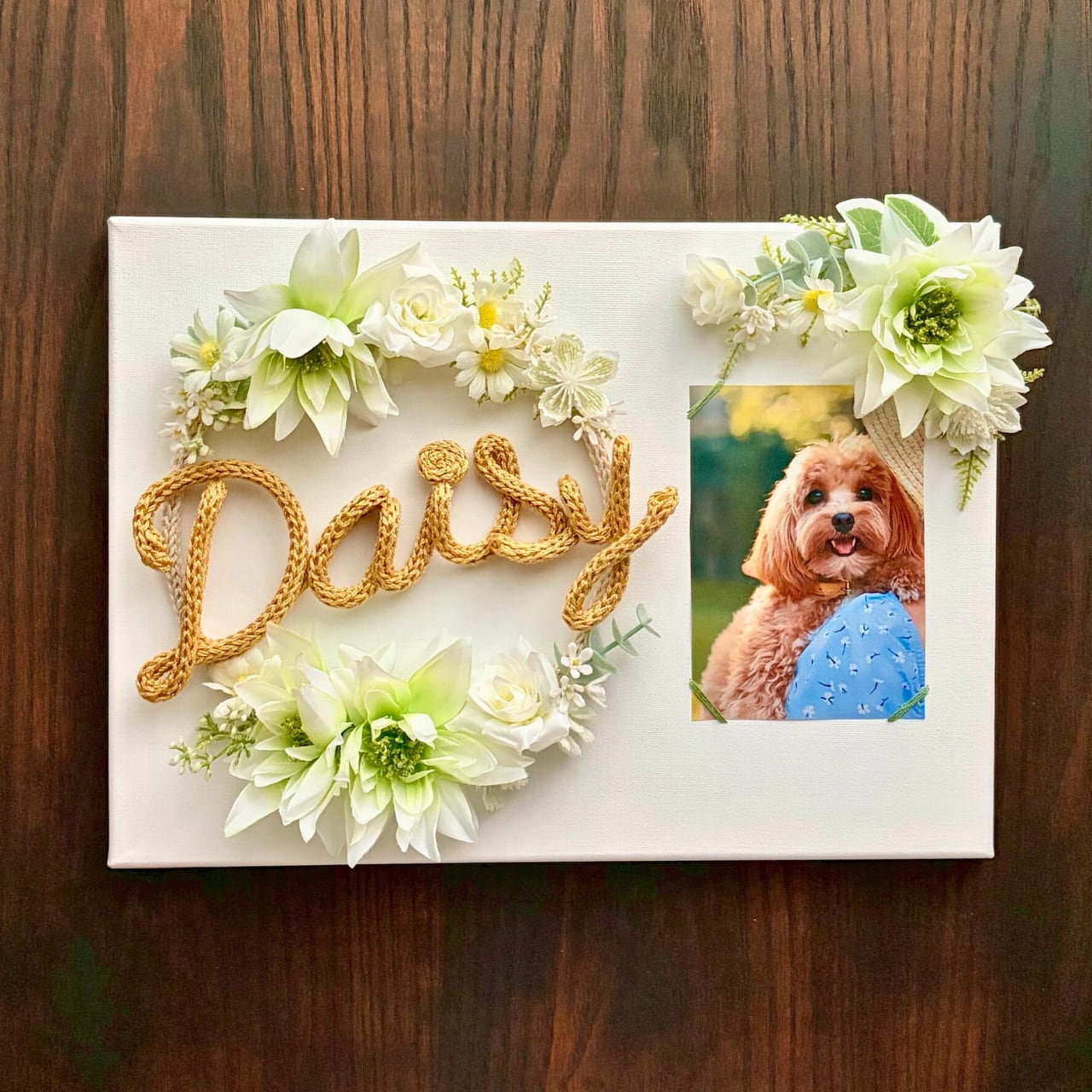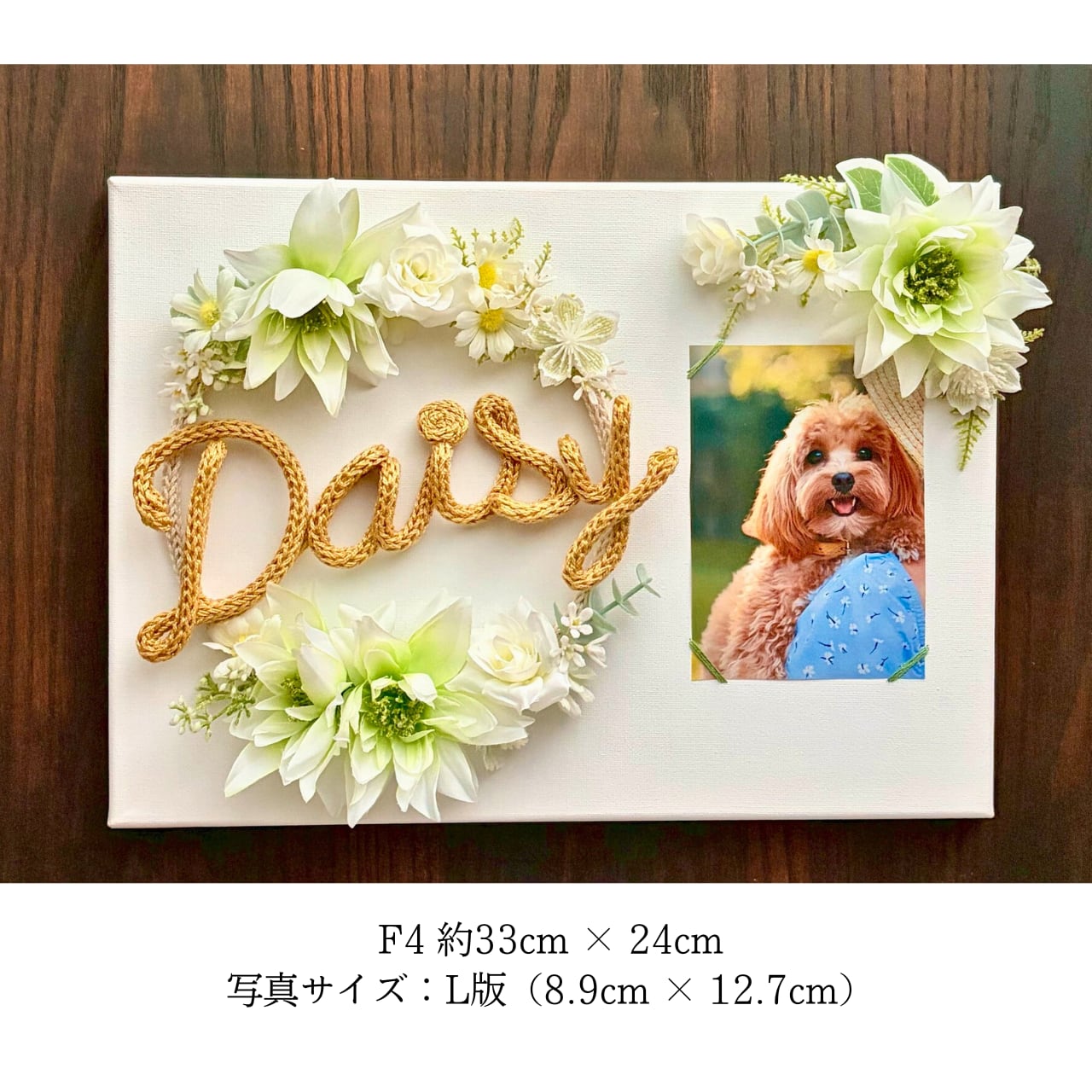 【恋するリース】をひと回り小ぶりに調整し、花材はより華やかなデザインに仕上げ、右側に写真を飾れる【フォトキャンバス】です。