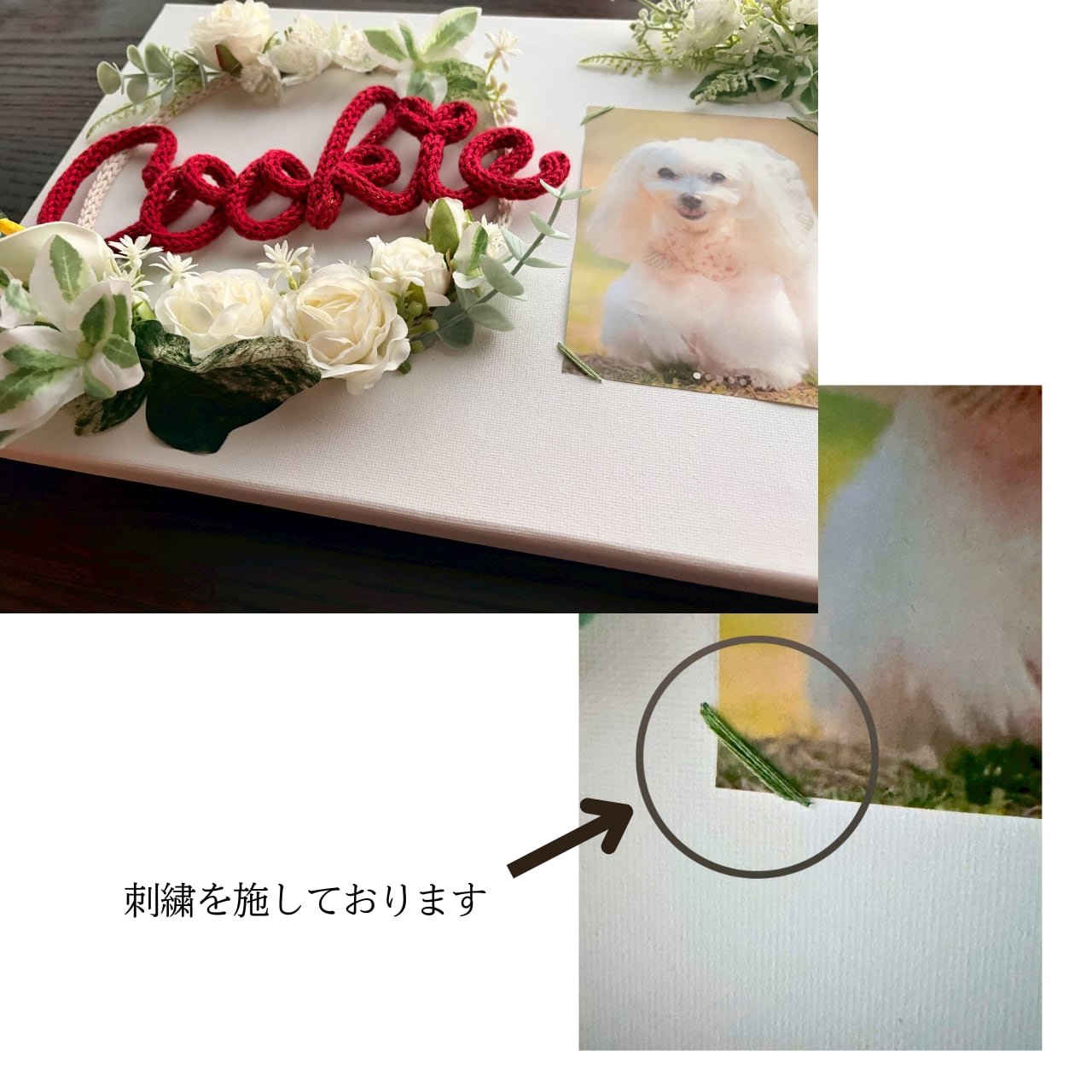写真を入れる部分には刺繍を施し、作品として美しく収まるよう仕上げています。刺繍糸の色は、全体の色合いや雰囲気に合わせて当店にてお選びいたします。