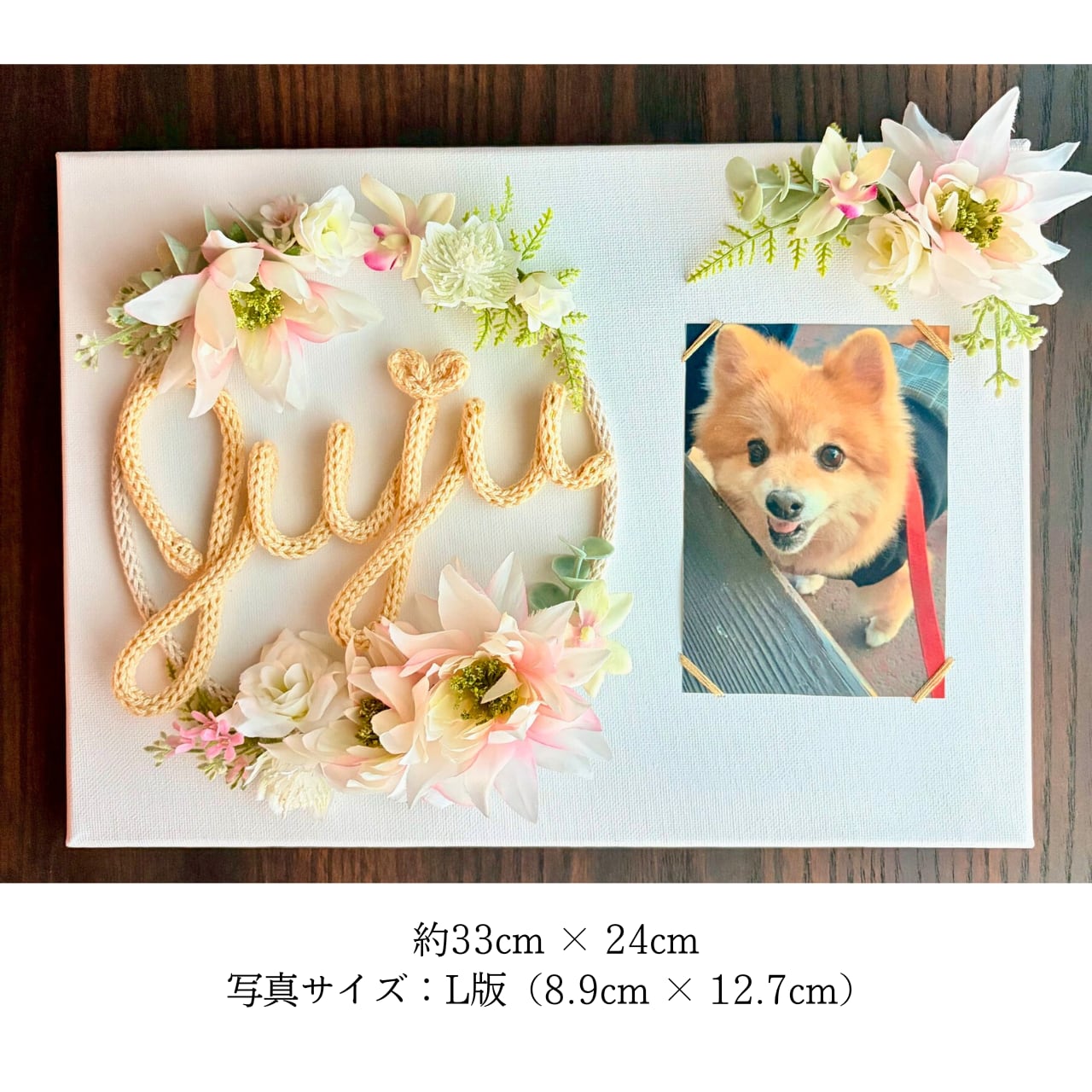 【恋するリース】をひと回り小ぶりに調整し、花材はより華やかなデザインに仕上げ、右側に写真を飾れる【フォトキャンバス】です。