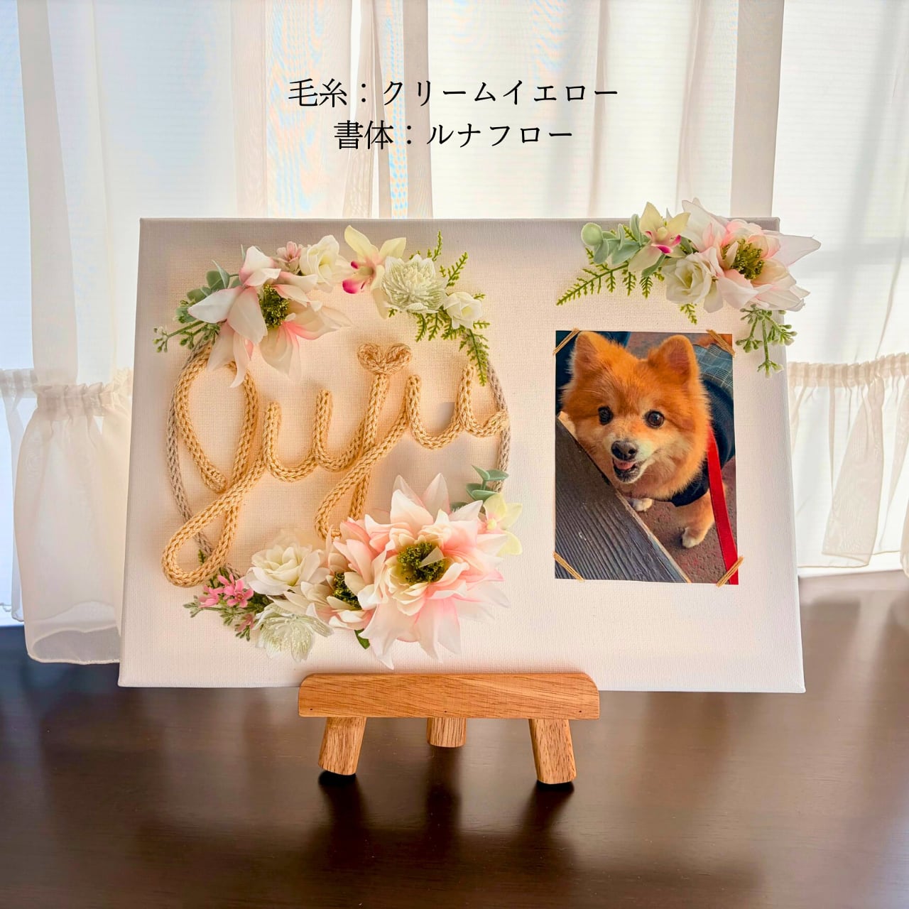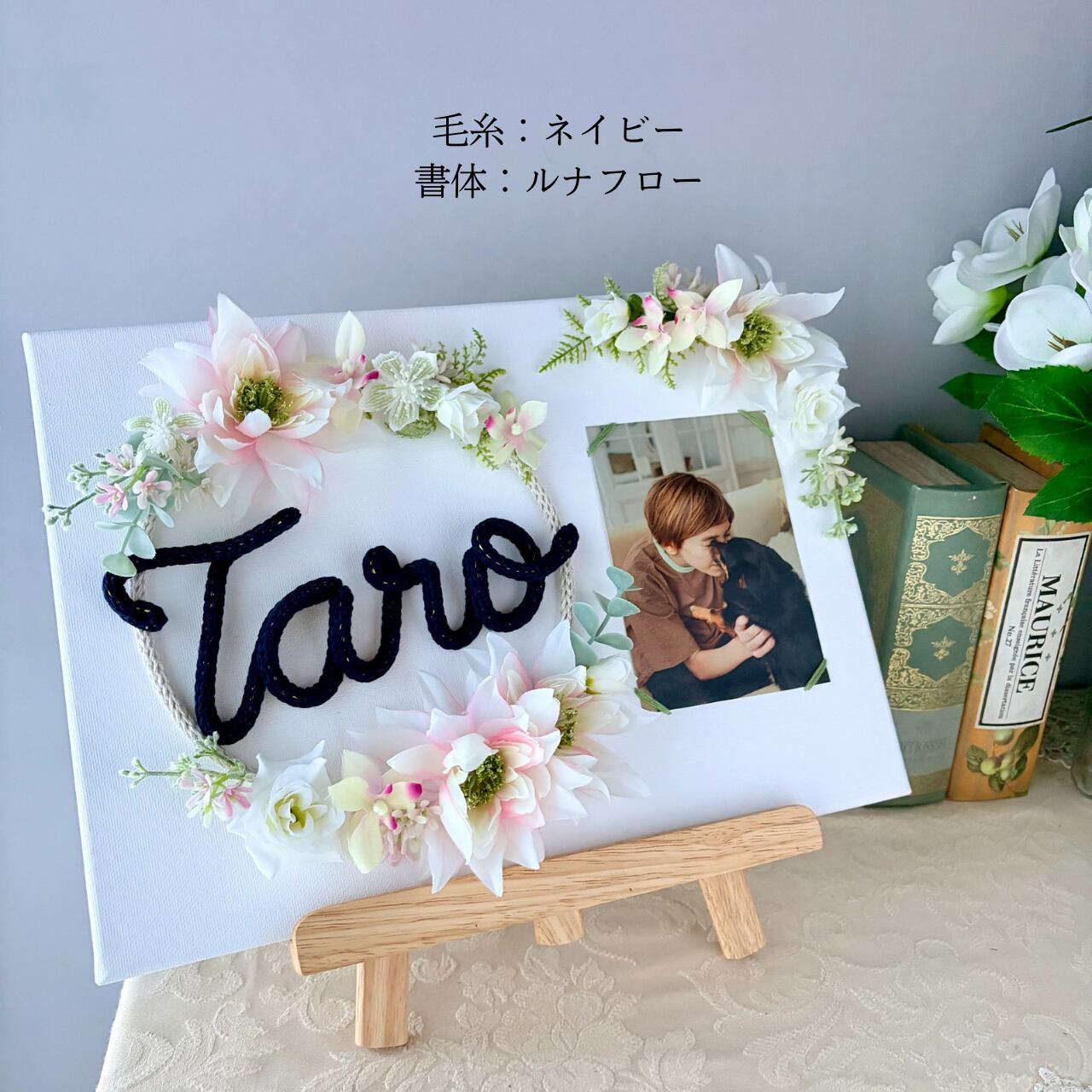【イーゼル付き/名入れ】恋するリース/フォトキャンバス【花色:ニュアンスピンク】文字色12色から選べる