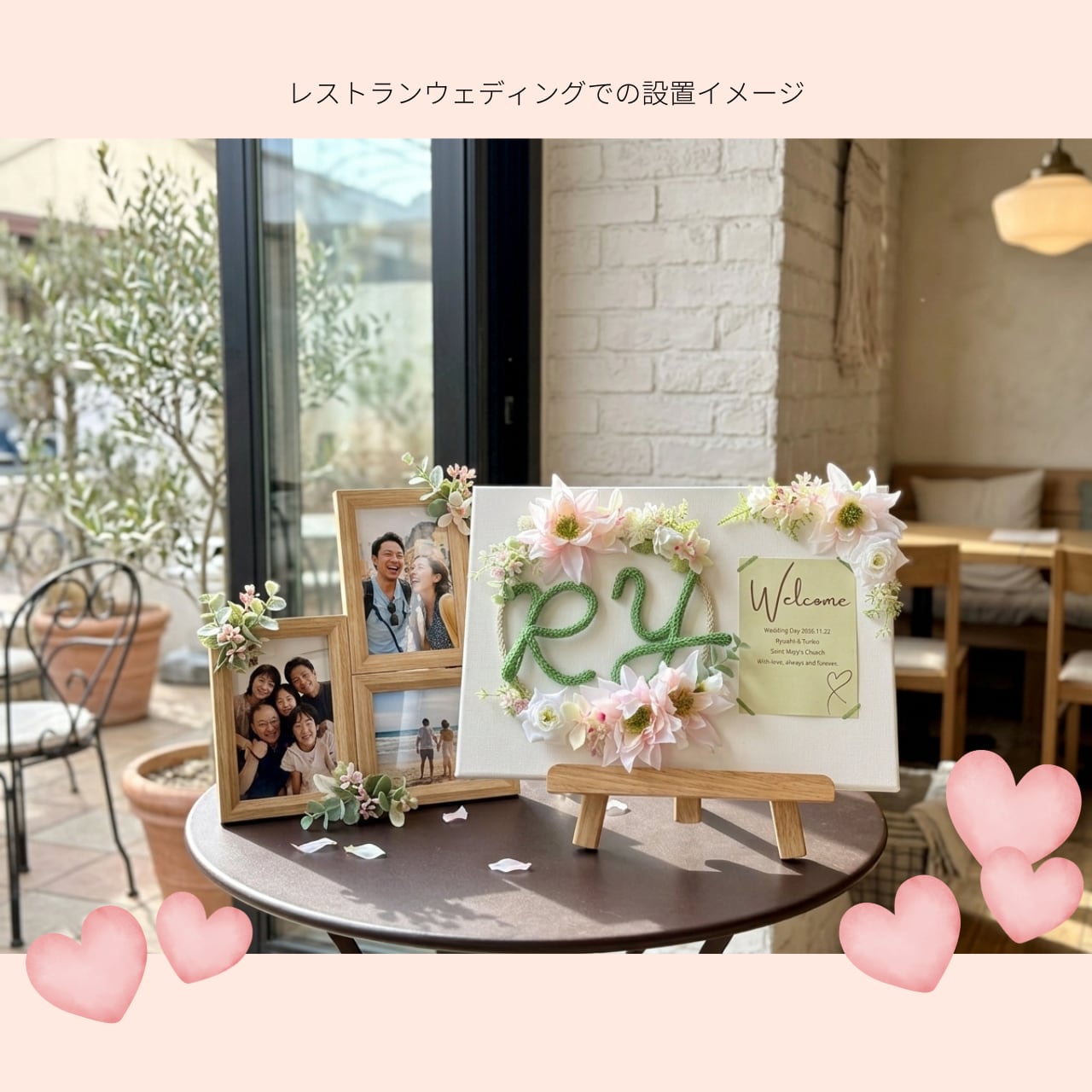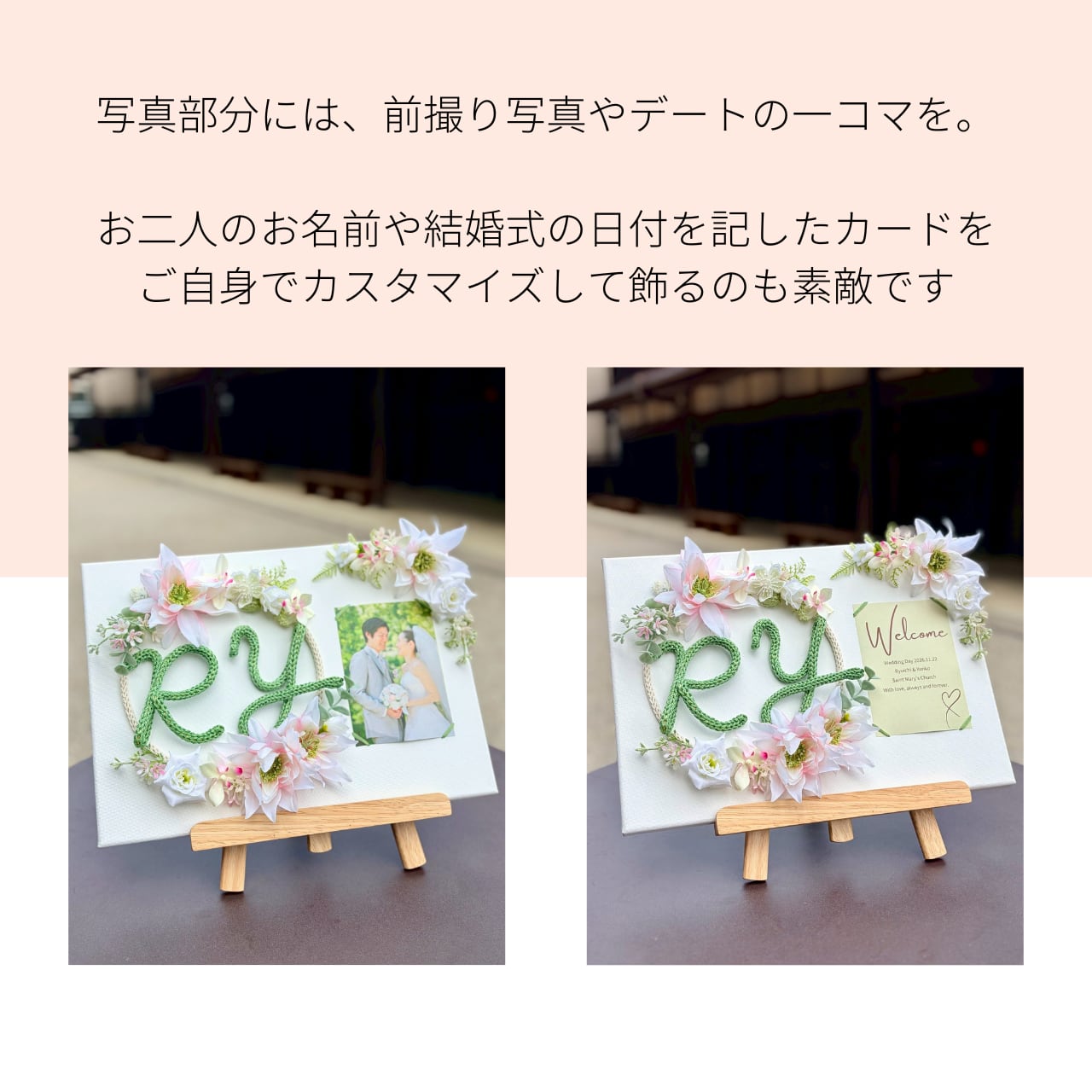 右側には、お写真を美しく飾れるスペースを。お二人の前撮り写真や思い出の一枚を添えることで、空間に自然な温もりが生まれます。